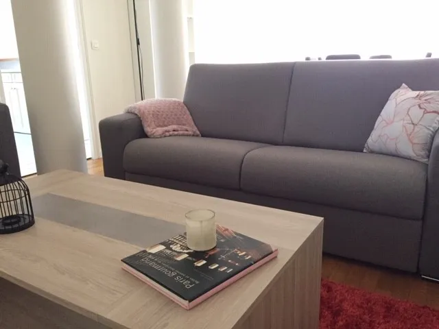 We furnished her apartment with a 3-seater sofa bed, two armchairs, a coffee table, a TV stand, a bookcase, a carpet, a desk, a desk chair and a desk lamp. In the dining room, we rented a table and 8 chairs, a buffet and a carpet. In terms of appliances, we rented a dishwasher, a microwave, a washing machine and a dryer. In the kitchen, we put a table and 4 chairs.