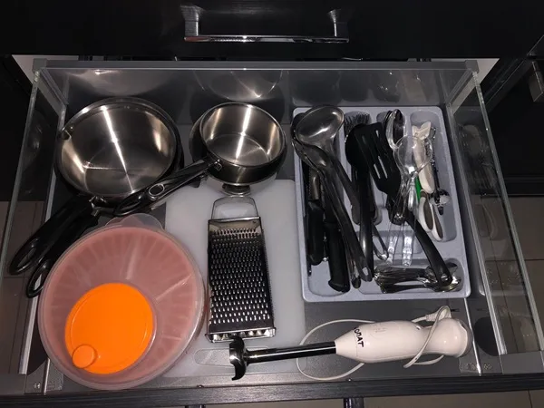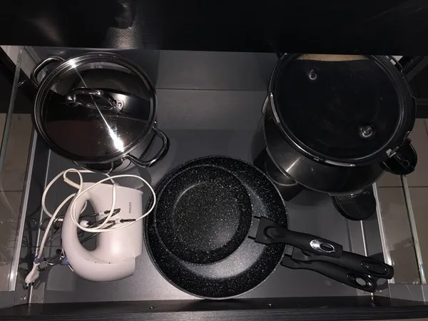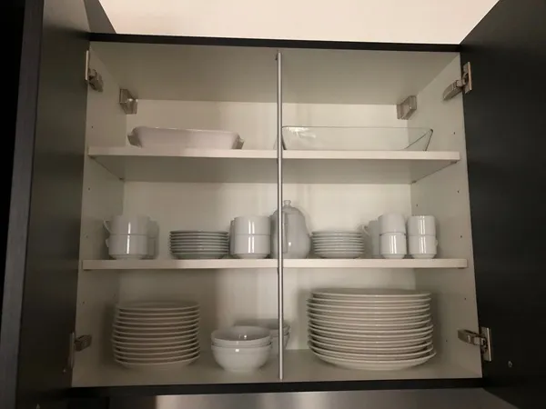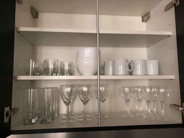 This set of dishes includes everything you need to cook (pots, pans, oven dishes), serve and eat (plates, cutlery).