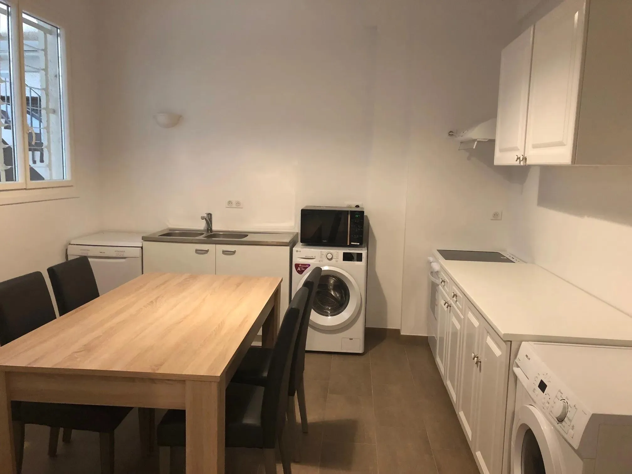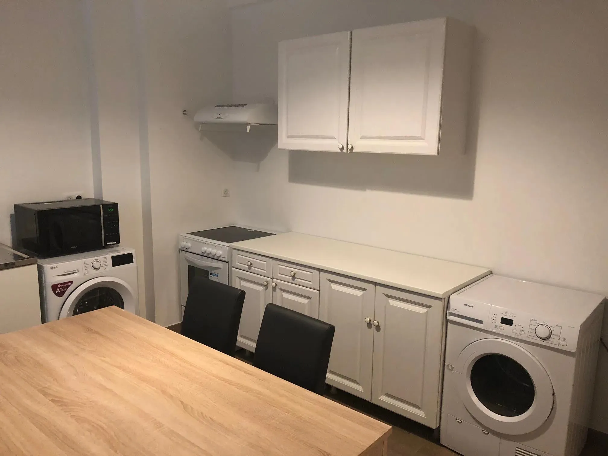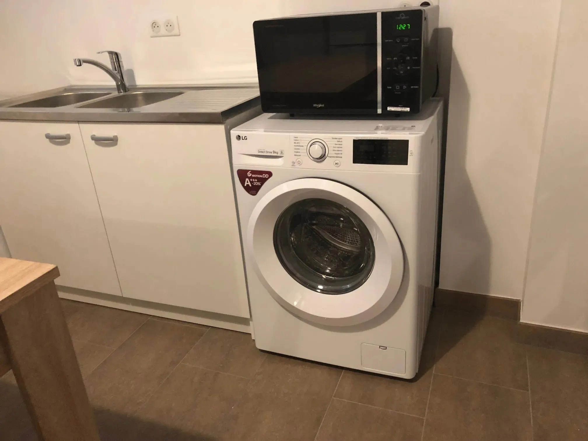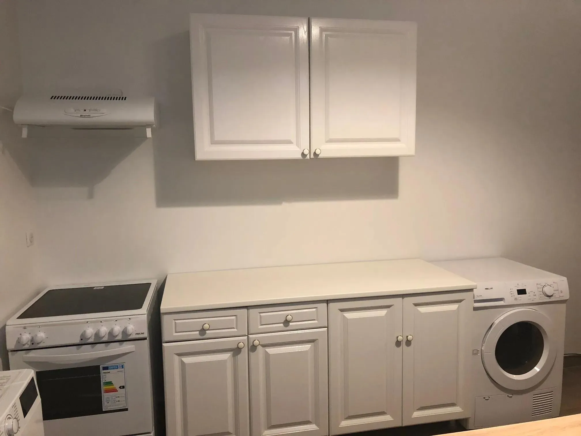 Nous avons entièrement aménage sa cuisine avec des meubles bas et plan de travail, ainsi que des meubles hauts. Nous avons fourni tout l’électroménager : cuisinière, réfrigérateur, lave-linge, sèche linge, lave-vaisselle et micro ondes. Nous avons complété cette belle cuisine avec une table et des chaises.