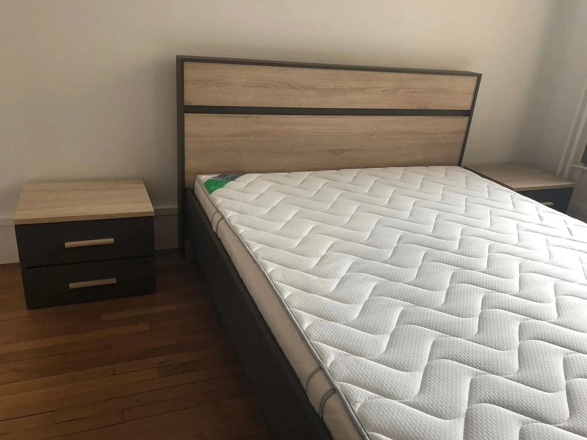 Dans la première chambre adulte, nous avons loué un lit double 160×200 cm avec une belle tête de lit, des tables de chevet et une commode. Dans la deuxième chambre adulte, nous avons loué également un lit double avec tables de chevet, commode et armoire assorties.