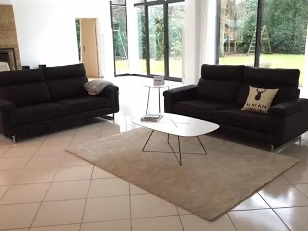 - Pour le salon, location de canapés, fauteuil, table basse, table de bout de canapé, lampadaires, lampe de table, TV 42′, meuble télé, tapis.