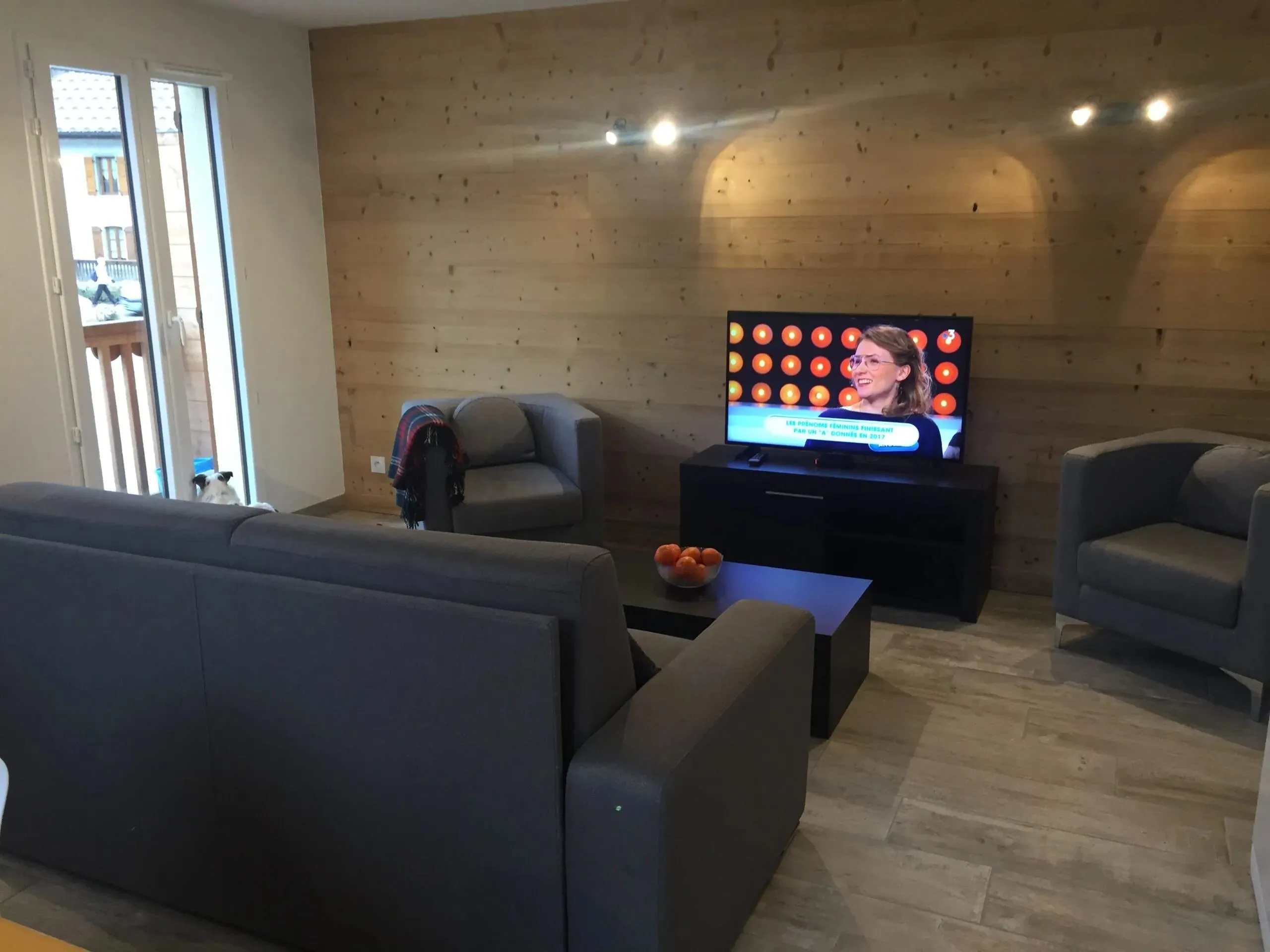 Nous avons meublé le salon avec un canapé convertible (pratique pour les couchages en plus), deux fauteuils, une table basse, une télévision et un meuble télé.