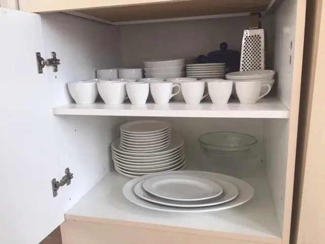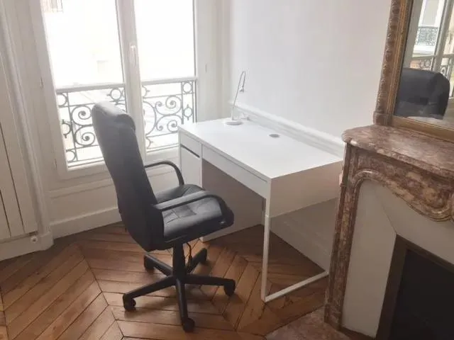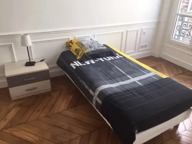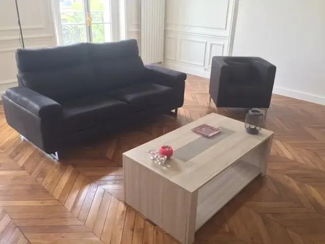 Nous avons meublé son appartement avec un canapé 3 places, un fauteuil, une table basse, un lampadaire, une télévision 32′, un meuble télé, 1 table et 4 chaises. Dans la cuisine, nous avons loué vaisselle et ustensiles pour 4 personnes (incluant une cafetière) et une poubelle, balai, pelle et balayette. Dans la chambre adulte, nous avons loué un lit double avec parure de lit et change, tables de chevet et lampes, une commode, un portant et des cintres. Dans la chambre enfant, nous avons loué et installé un lit simple avec parure de lit et change, une table de chevet avec lampe et un espace travail avec bureau, chaise et lampe. Nous avons également loué fer à repasser avec table, aspirateur ainsi que balai serpillère et seau.