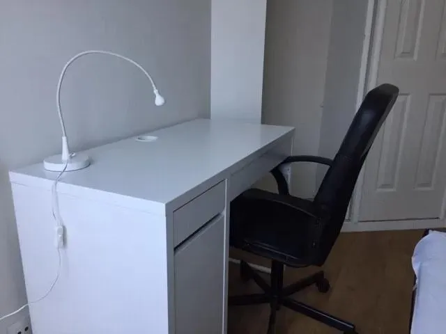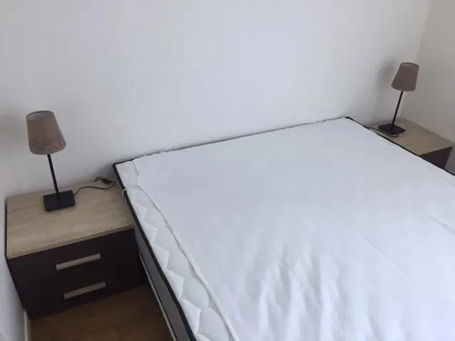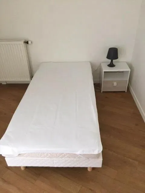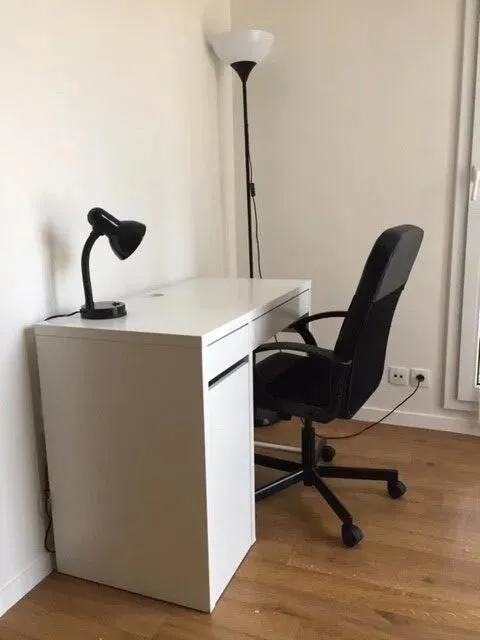 Dans la chambre adulte, nous avons loué un lit double avec tables de chevet et lampes. Et dans chacune des chambres enfants (3 au total), nous avons loué un lit simple avec table de chevet et lampe, un bureau avec chaise et lampe.