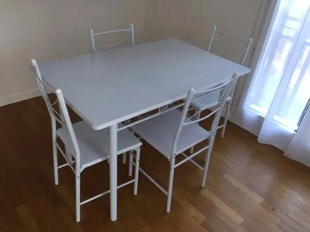 Nous avons meublé son appartement avec un canapé convertible 3 places, deux fauteuils, une table basse, un meuble télé, une bibliothèque, un tapis, un bureau, une chaise de bureau et une lampe de bureau. Dans la salle à manger, nous avons loué une table et 8 chaises, un buffet et un tapis. En terme d’électroménager, nous avons loué un lave-vaisselle, un micro ondes, un lave-linge et un sèche-linge. Dans la cuisine, nous avons mis une table et 4 chaises.